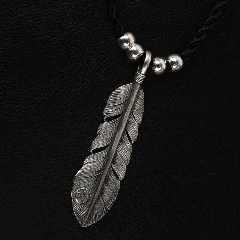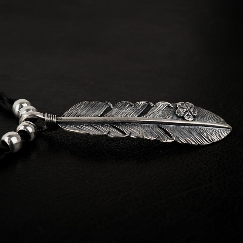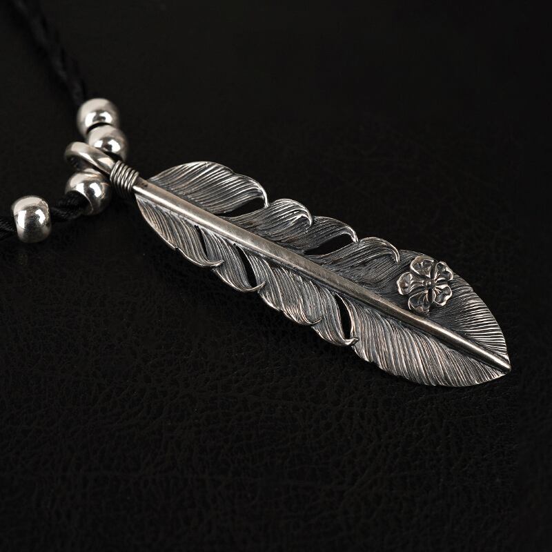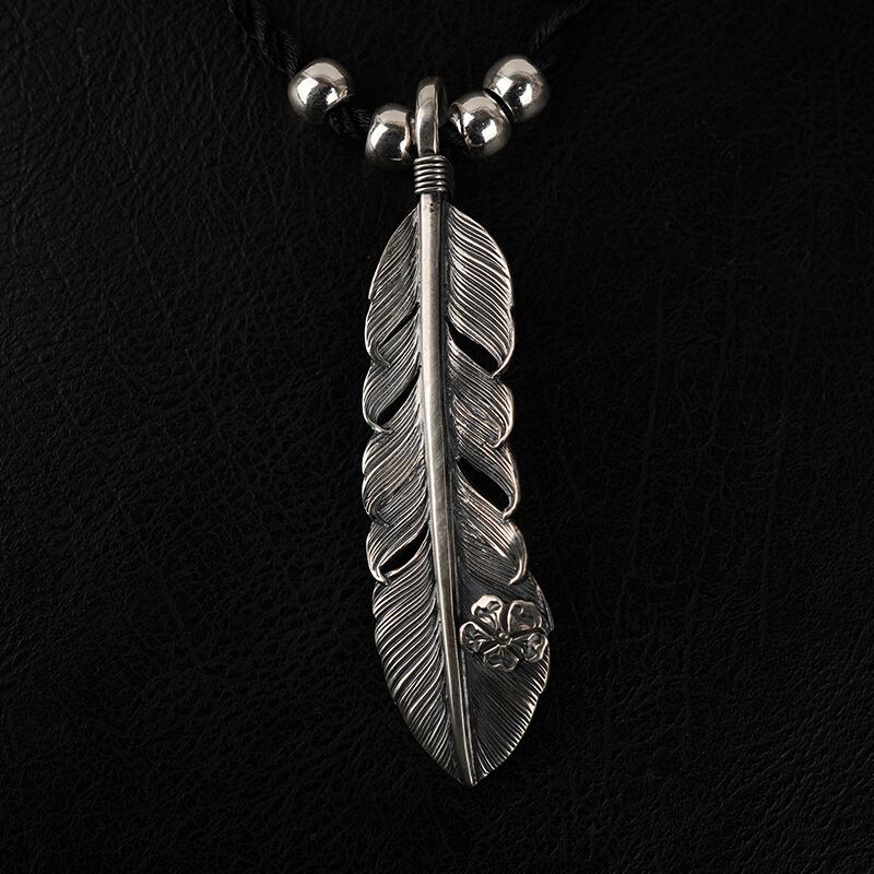 XLサイズ銀線まき純シルバーローズ付きフェザーペンダントトップ(左向き)