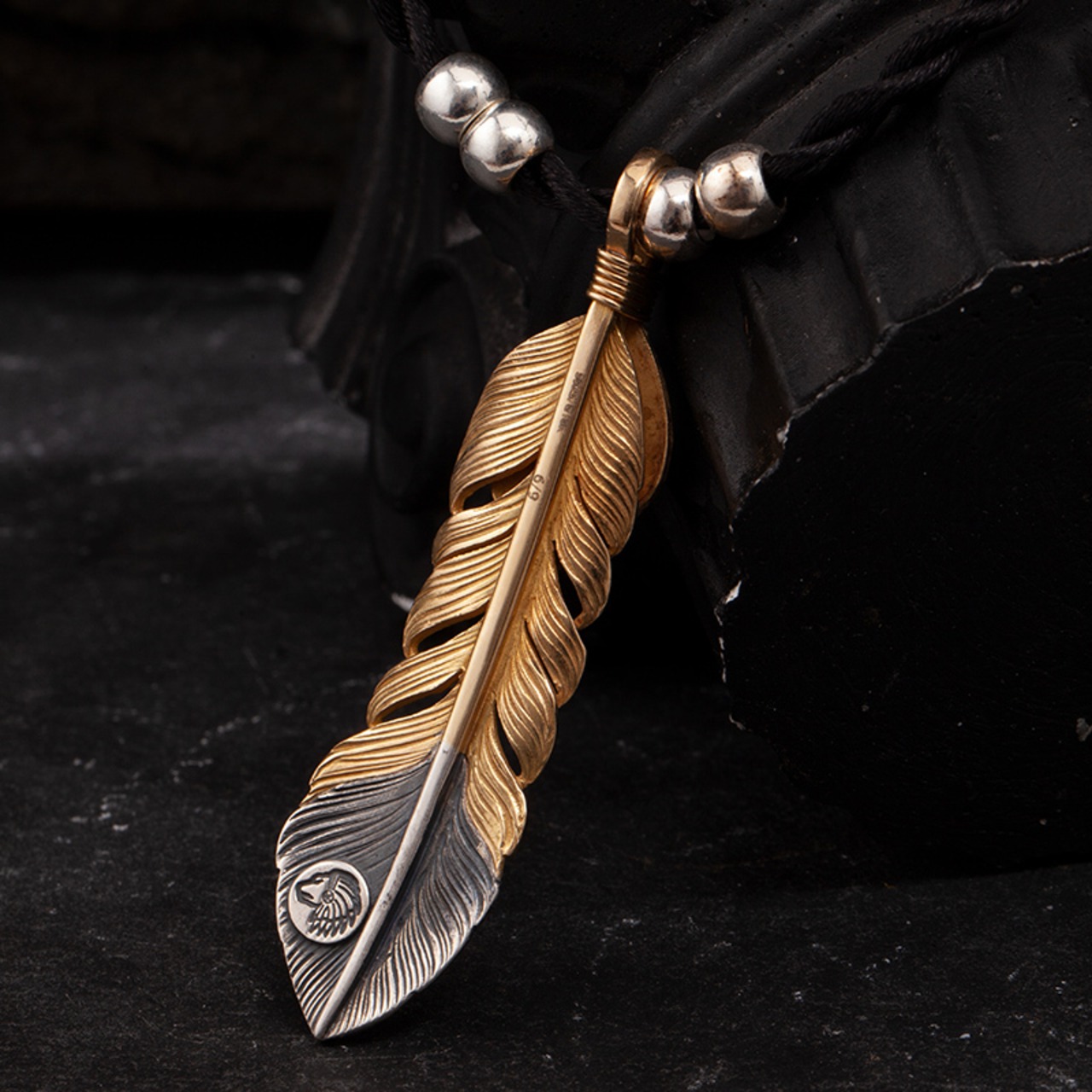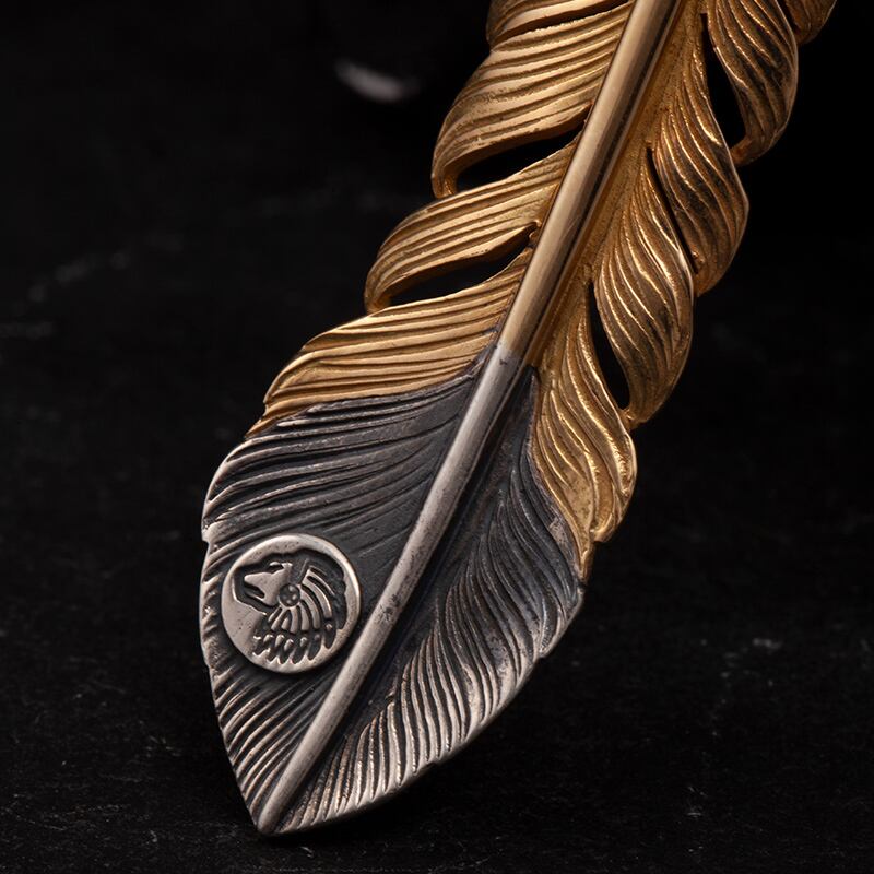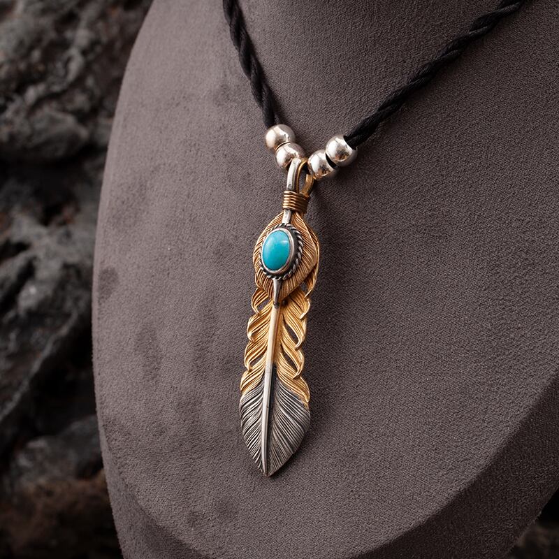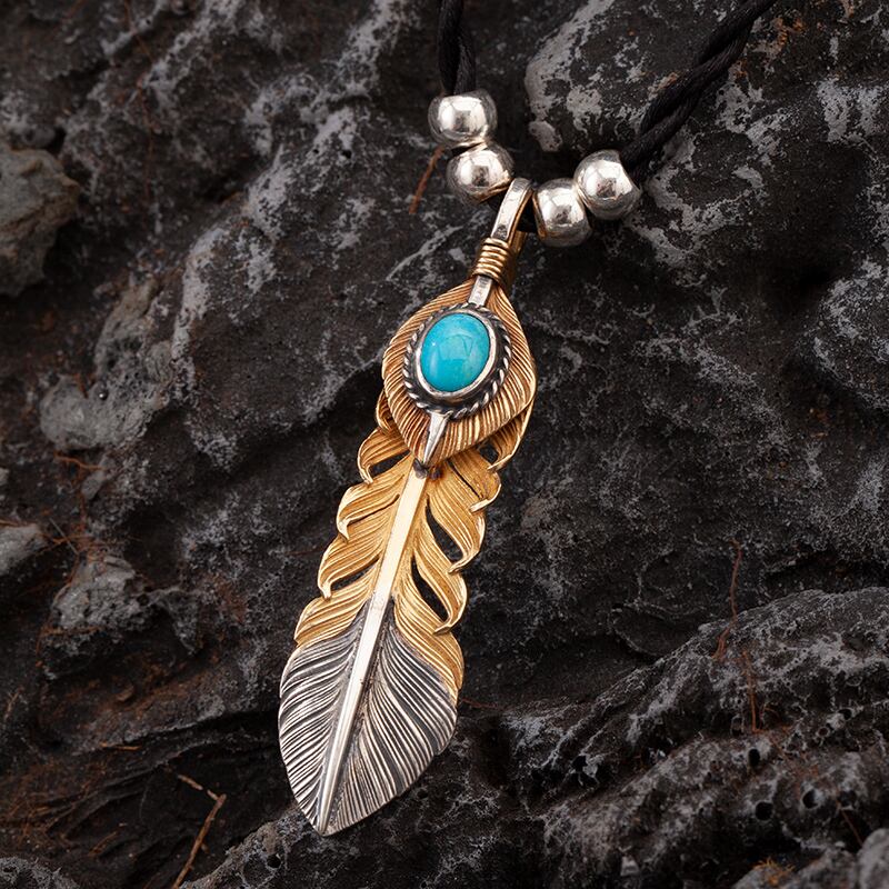 Lサイズ18K金線まき18K上金ターコイズ逆金フェザーペンダントトップ(左向き)