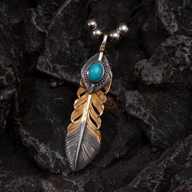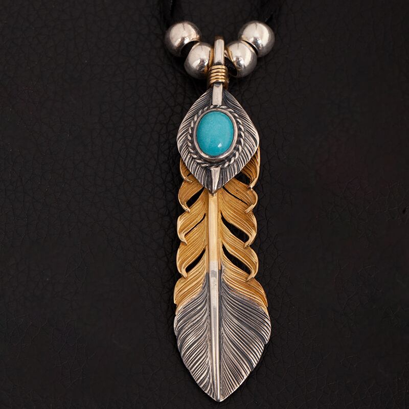Lサイズ18K金線まき18K上銀、銀インレイターコイズ逆金フェザーペンダントトップ(左向き)