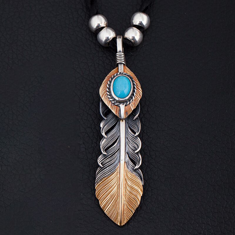 Lサイズ18K金線まき上金、銀インレイトパせき付き先金フェザーペンダントトップ(右向き)