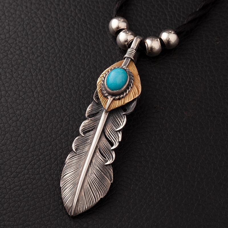Lサイズ銀線まき上金、銀インレイトパせき付きフェザーペンダントトップ(左向き)
